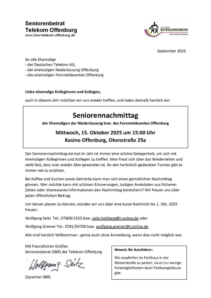 Wir freuen uns, dass sie die Webseiten des Seniorenbeirats Telekom Offenburg besuchen. Der Seniorenbeirat ist ein Organisationseinheit der Stiftung Betreuungswerk Post Postbank Telekom.